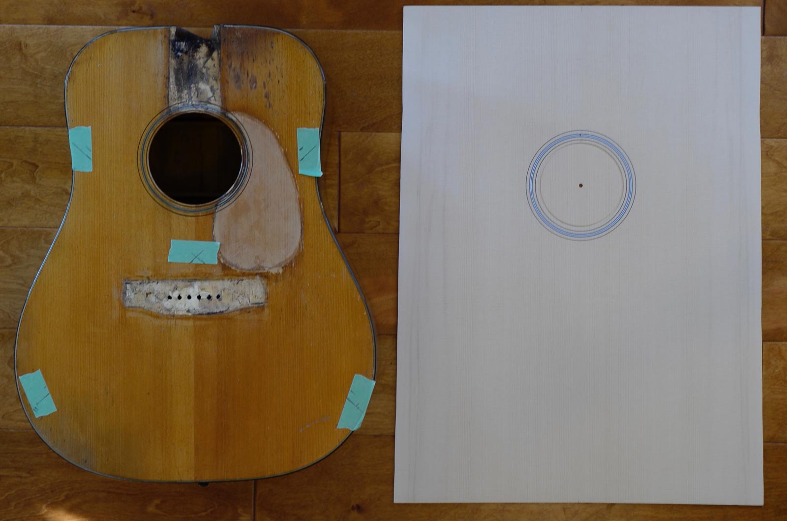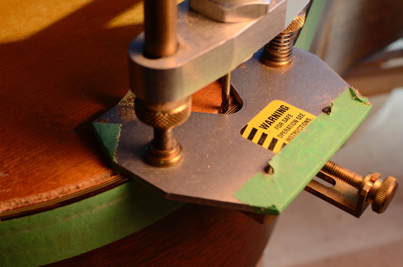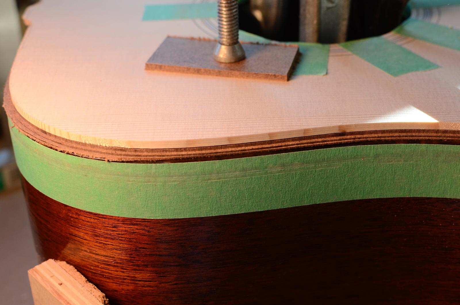 I decided to replace the top without replacing the delicate tortoise celluloid binding and purfling. So, I made a new top plate and matched the soundhole and rosette to the original top, then used the guitar body as a pattern to guide my binding router so that I could size the new top to fit inside the existing purflings. Once the top was trimmed to size and shape, I used a purfling router setup to cut the old top off.
