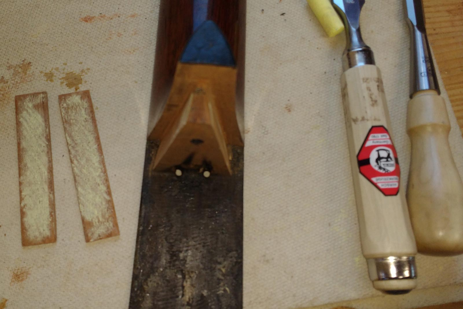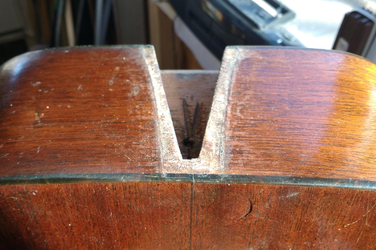 Now that the body is back together, it’s time to fit the neck joint again, correcting some problems with the alignment. This neck needed to go way back to allow the right string height over the soundboard, so I’ll need pretty thick mahogany shims to fit the dovetail. When I took the neck off originally, I noticed that the tenon was cut off-center on the neck, and that the factory made up for it by routing the neck pocket off-center, too (or vice versa). It complicates the neck reset slightly, but mostly is just a curiosity. As is the large wood screw that was screwed through the body’s neck block into the neck’s tenon. The neck has been reset at least once, and the screw is probably a clue that the reset didn’t go that well.