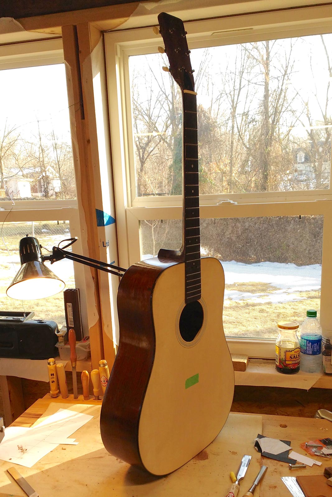I’m currently finishing the top of this guitar, then I’ll need to reset the bridge and glue the neck in place. But, it shouldn’t be long until the guitar gets to try out her new voice. This guitar has been well-loved; it’s clear from the many repairs that have been done to it over the years to keep it going. I hope that the repairs I’m doing now will set her up for a long and happy second life.