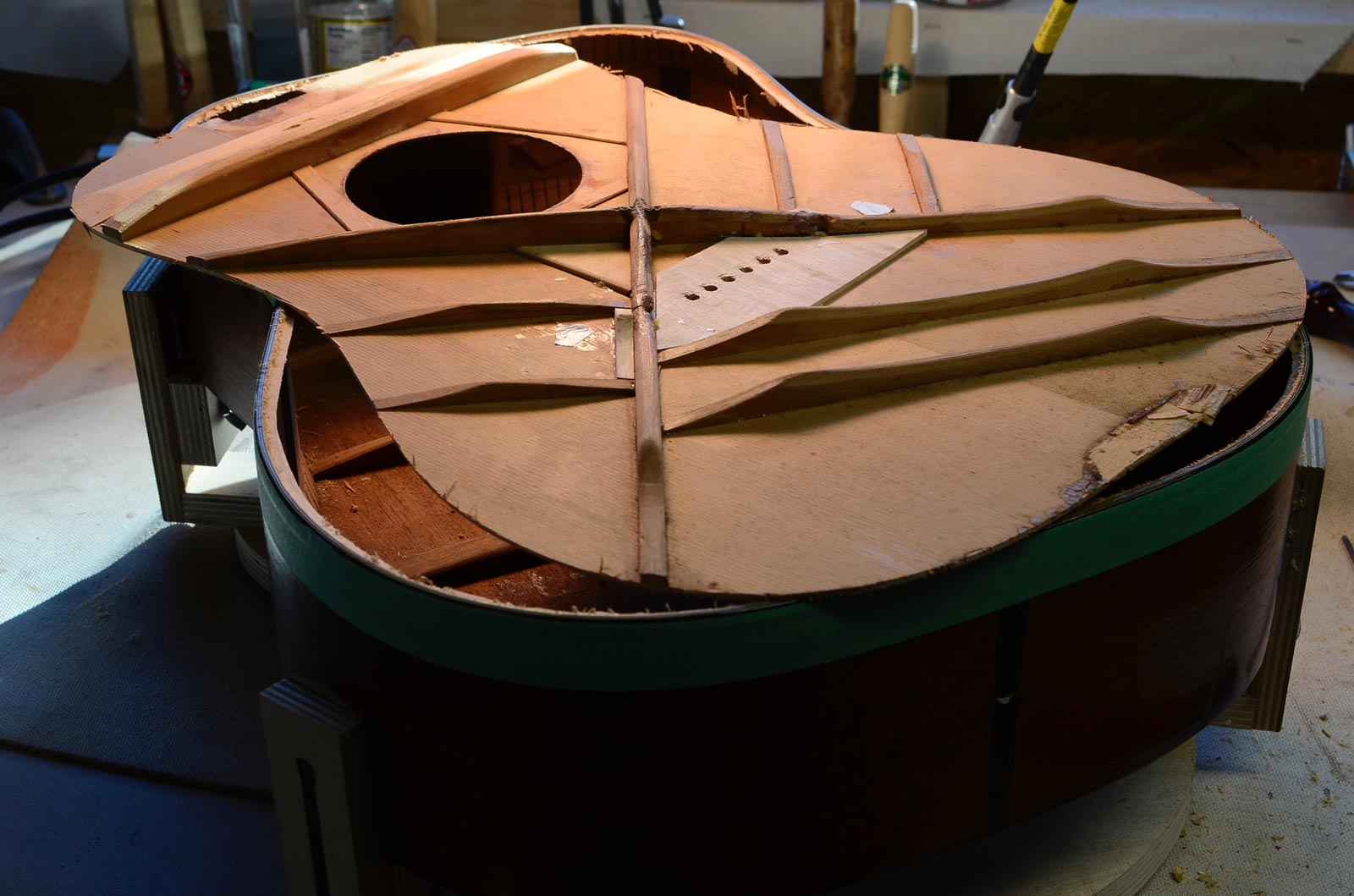 I looked more closely, and Bill says, “You know, the bridge has been reglued a few times since I got it in the eighties.” I felt around the top a little more carefully and realized that it was thin and yielded easily to light thumb pressure. Looking inside, you could see where the X brace legs had been drilled through and extra bracing had been added alongside the damaged sections. It seemed like the best course of action was to remove the back and replace the top braces that were so weak. Once I got to work on the guitar, the first tasks were to remove the bridge and neck.
