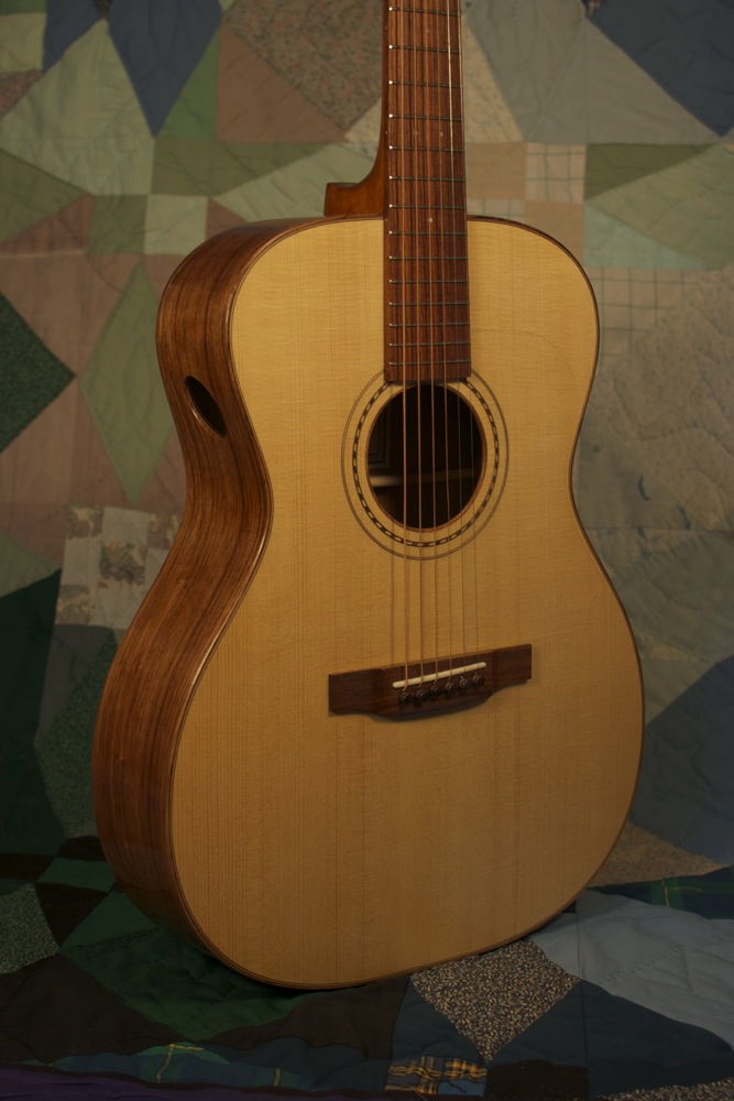 This is a wonderfully balanced guitar with great string and note separation. The palo escrito sides and back glow under the French polished finish. In addition, I’ve added a sound port for the player, solving one of my biggest complaints with rosewood guitars: the player can’t gauge the guitar’s sound accurately, especially in loud or large rooms. You’ll know what you’re doing right (and occasionally wrong, maybe) with this guitar. \