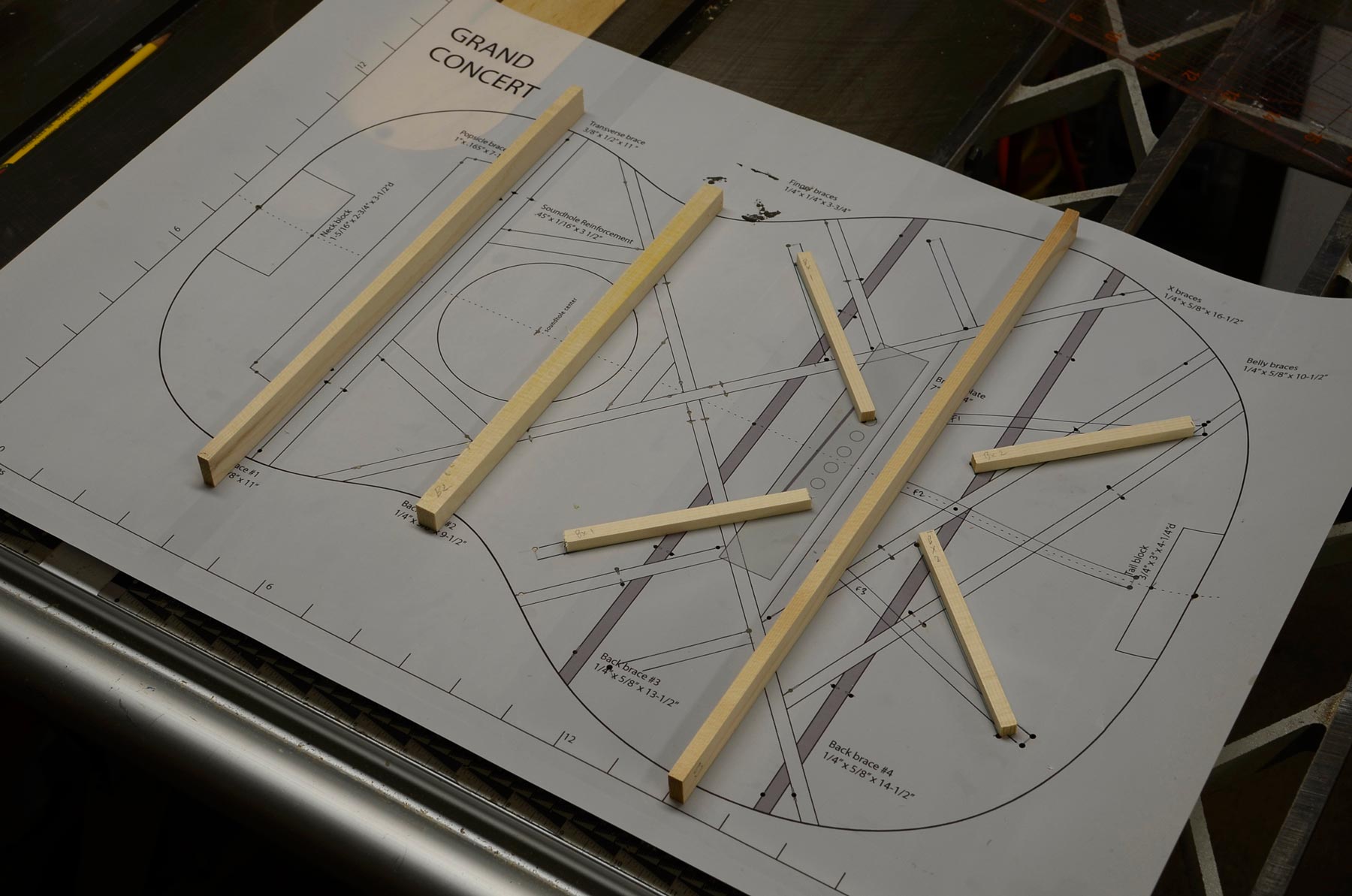 I’ve recently started a new build, an adirondack and sugar maple 12-fret grand concert guitar that will be clean and contemporary-looking, with a sound port and paddle headstock featuring really sharp-looking Gotoh “X-finish” tuners. Notably, this guitar will be my first production guitar to use double sides and solid lining, which I’m pretty excited about. The goals for this guitar’s sound are a focused bass with good carrying power and trebles that are thick, musical and committed.