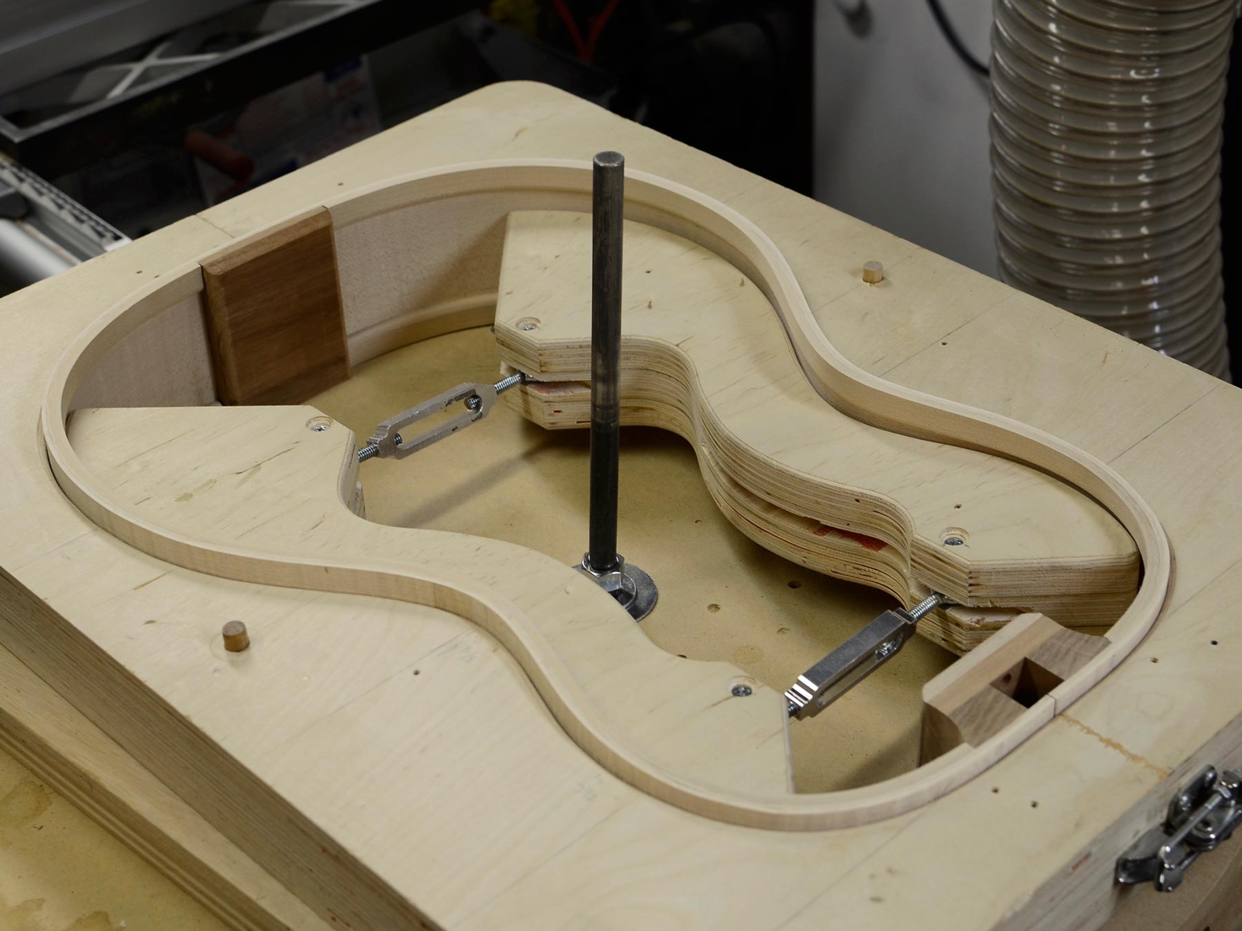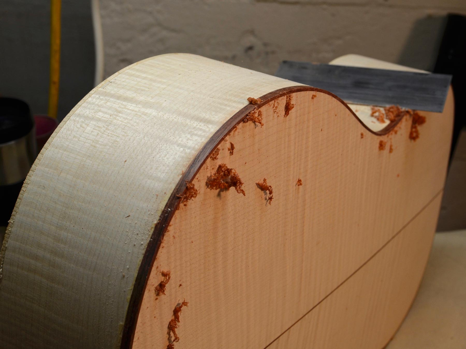 I’m pleasantly surprised by the increased stability of the assembled rim. I use a lot of maple, and maple really wants to spring back after bending, but these doubled sides are rock-solid. Once they came out of the vacuum bag, the doubled sides were locked in shape, and I didn’t have to wrestle them into the form to keep their shape. I expect this to take some stress out of the completed instrument body, too.