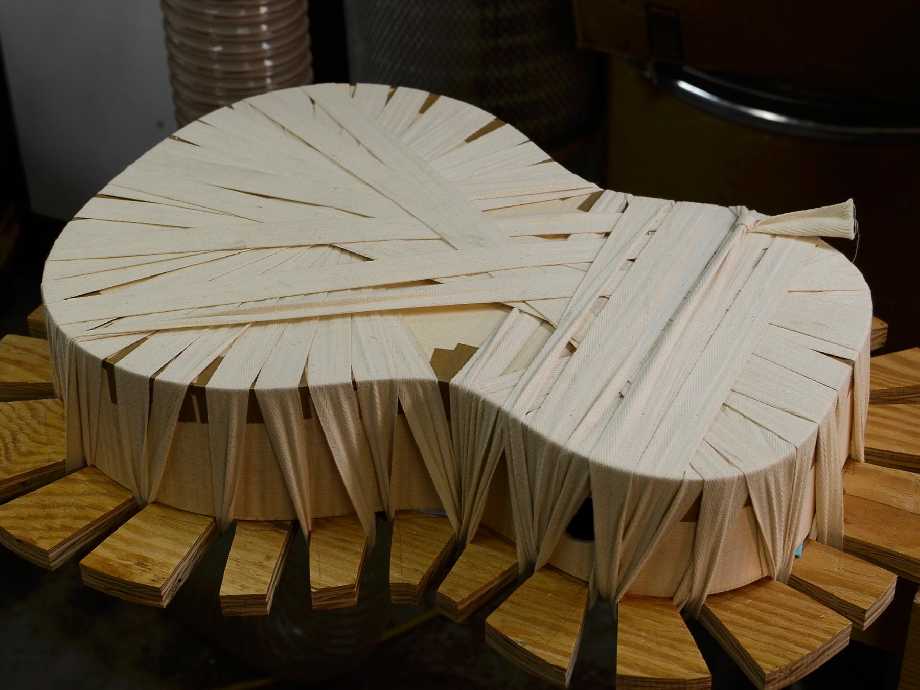 So in developing my client’s guitar, I decided that I’d add mass and stiffness to the ribs by laminating together two slats, and use laminated-in-place solid linings instead of kerfed linings. Basically, I’m building a lightweight, guitar-shaped banjo rim and counting on the mass and stiffness difference to dial down the response of the sides and encourage the top and back to communicate more freely.