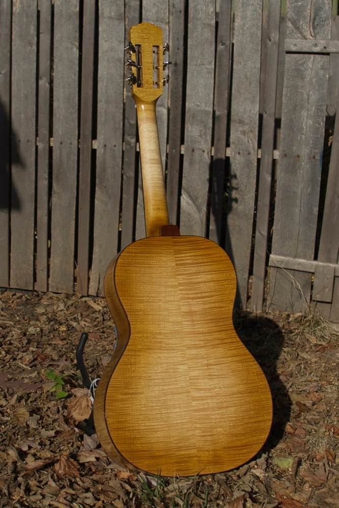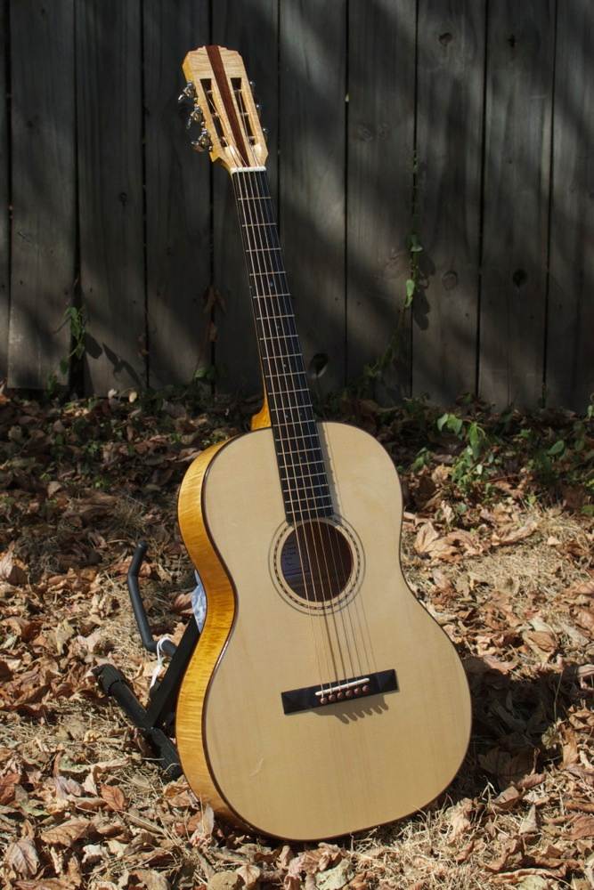 The body is finished with a French polish and water-borne varnish sandwich, and the neck is sugar maple with an oil finish. The sugar maple and Adirondack spruce top were supplied by Old Standard in Callaway County.