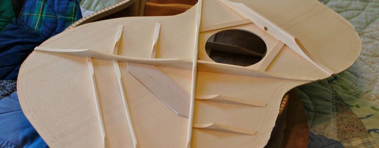 I’m about ready to close the boxes on my Orchestra & Auditorium prototypes and thought I would share a little bit about how they are coming together. I’m using Adirondack spruce tops with light and strong Adi bracing. I’m still amazed at how stiff this brace wood is, when properly cut. I’ve finished carving the braces for the tops and backs and the plates sound good. Here’s a little recording of the thump test.