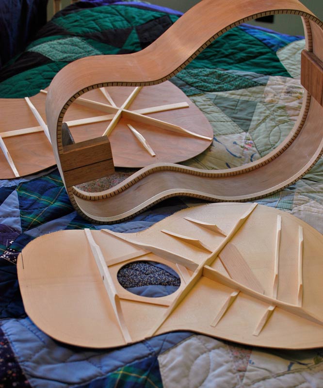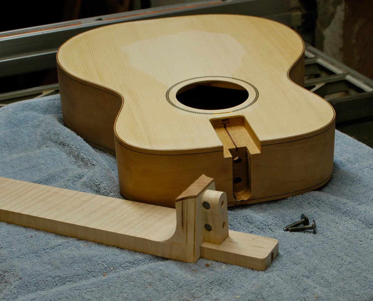 The neck is attached to the guitar using four bolts and no glue, so it’s easy to take off for future repairs. Continue reading “Neck Joint for the Auditorium and Orchestra Prototypes”